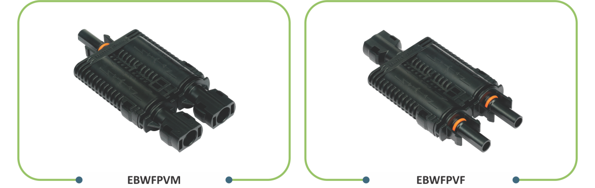elmex PV Solar Branch Inline fuse connectors EBWFPVM and EBWFPVF are applicable for parallel connection for Photovoltaic string protection depending on on-site application. Branch inline fuse connectors have 3 branches, 2 for inputs either male or female and 1 for output either male or female. These connectors have plug and socket design and are constructed using flame retardant engineering thermoplastic suitable for exposure to UV rays & for application in PV power generation system.elmex PV branch inline fuse connectors are suitable for use with gPV (Cylindrical) fuse of ø 10 X 38 mm.